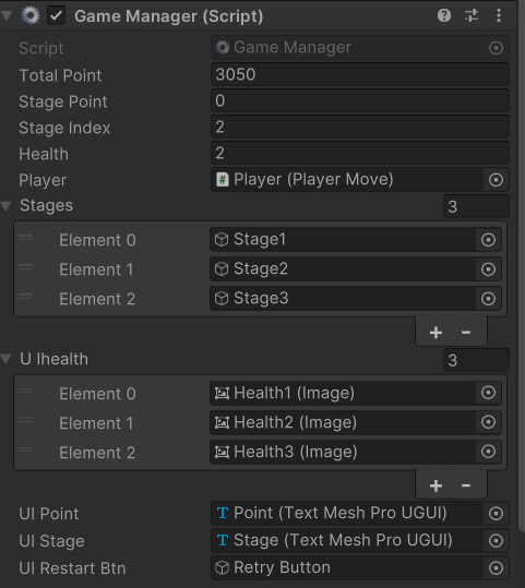 GameObject들을 배열을 사용하여 Stages로 선언한다.