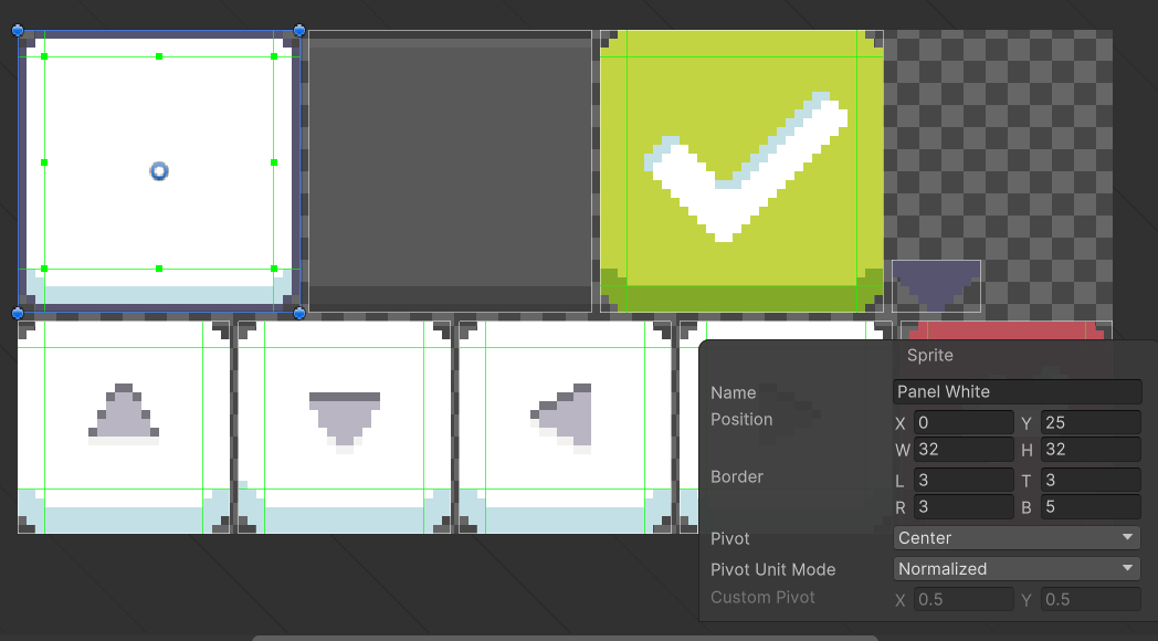 미리 설정을 해뒀는데, Border부분에서 숫자를 건들이면 그림에서 초록색부분으로 뜬다. 초록색 바깥쪽으로는 픽셀이 깨지지 않는다. apply한 다음에 이미지에서 sliced로 바꿔주면된다.