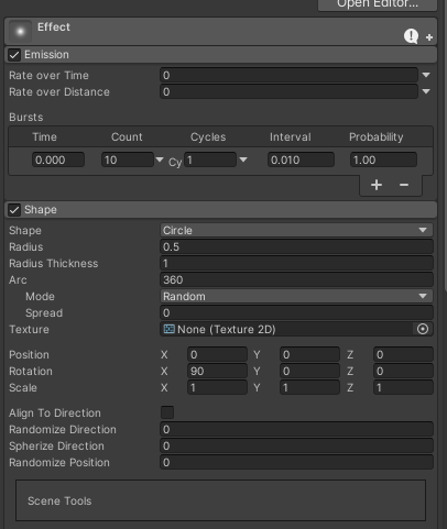 이펙트를 보면 rotation이 0 0 0일때, 원뿔이 뒤집어진 모양으로 위로 파티클이 퍼지는것을 볼수있다.