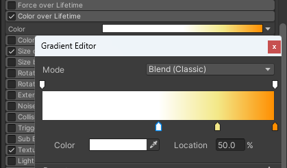 start Lifetime은 입자의 기본지속 시간으로, 0.5초에서 1초 사이 랜덤한 값으로 해주었다. 원래는 1 이런값이었는데 오른쪽 역삼각형을 눌러서 바꿔주었다.