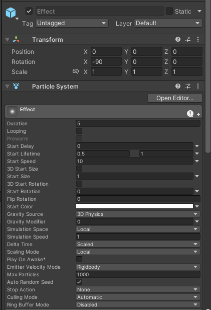 start speed는 10으로 설정해주었고, Play On Awake는 꺼주었다. 이것은 시작할때 바로 실행되게 하는것인데 이 이펙트는 바로 실행되면 안되기때문이다.