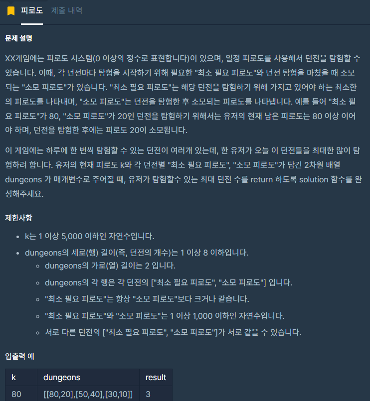 if i not in visited and dungeons[i][0]<=k: # 방문하지 않고 최소 피로도가 k 이하일때