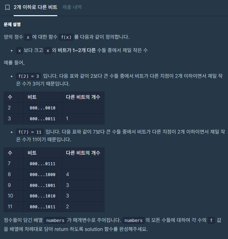 [프로그래머스 Lv2,python] - 2개 이하로 다른 비트 본문