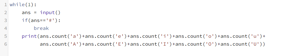 각 대문자 소문자로 나타난 모음들의 개수의 합을 프린트하고, #를 입력한다면 break를 걸어 끝나게합니다.