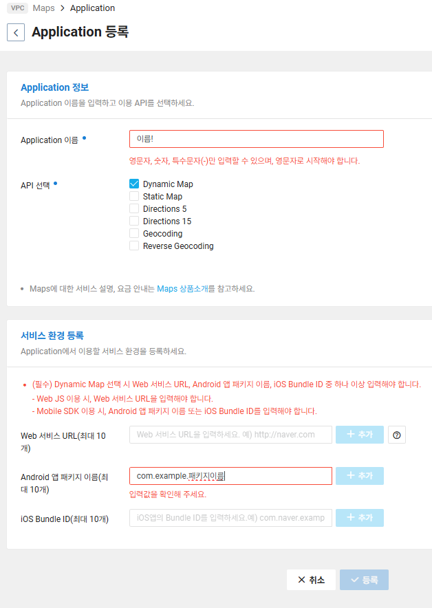 Maps를 누른 뒤, Application 등록을 통해 아래와 같이 입력해줍니다! API선택은 Dynamic Map으로 해줍니다.